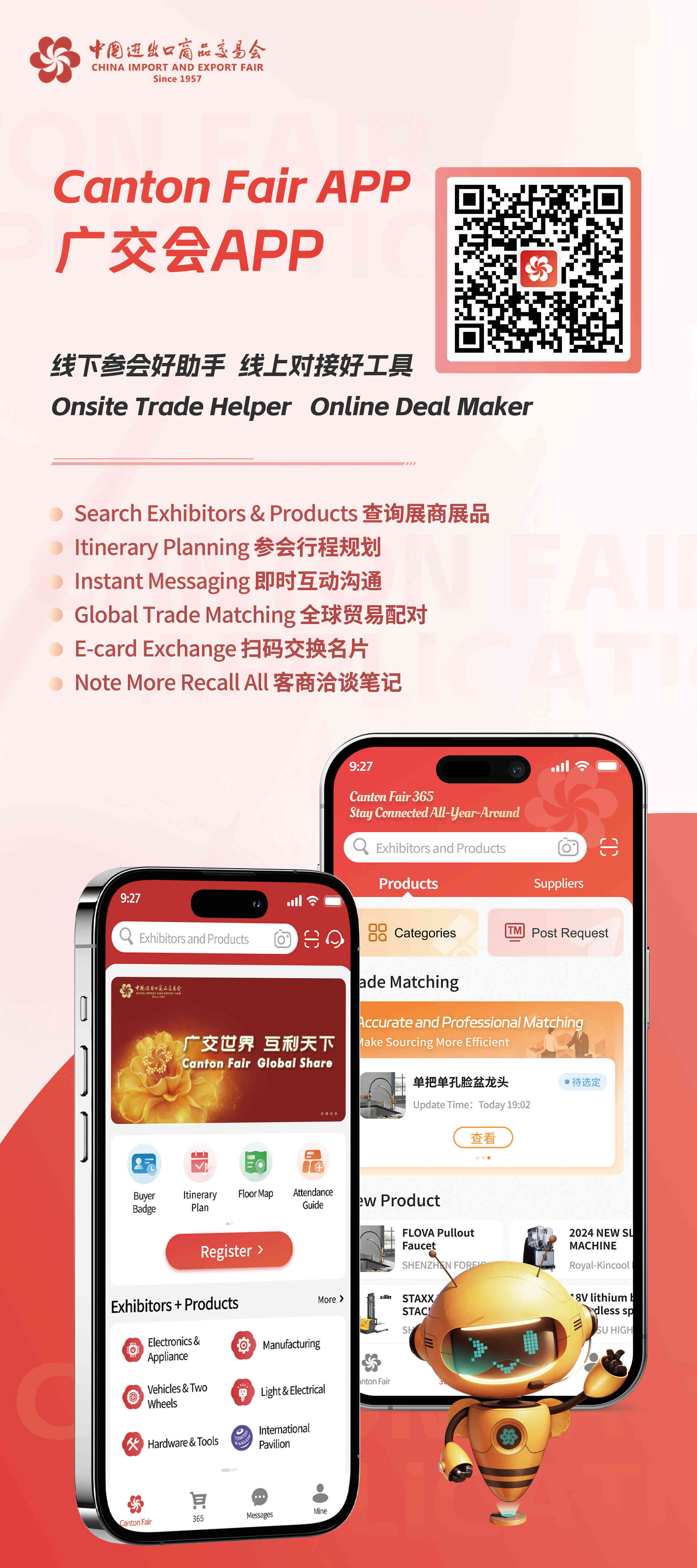四是特色产品更多。大量创新产品将纷纷亮相。第一期产品将凸显新质生产力,展示新能源、智能网联汽车、智能制造等领域的最新成果,人形机器人、机器狗、机器人灵巧手、陪伴机器人、咖啡机器人、巡检机器人、医疗机器人、配送机器人、清洁机器人等将在服务机器人专区展出,智能家电、VR眼镜、智慧穿戴设备等产品将亮相“智慧生活”专区。第二、三期产品将突出设计创新、绿色低碳,以及个性化、定制化。广交会常态化运营线上平台,采购商既可在线下近距离观看、体验产品,也可随时通过广交会线上平台、广交会APP观展,多维度感受“中国智造”的创新活力。